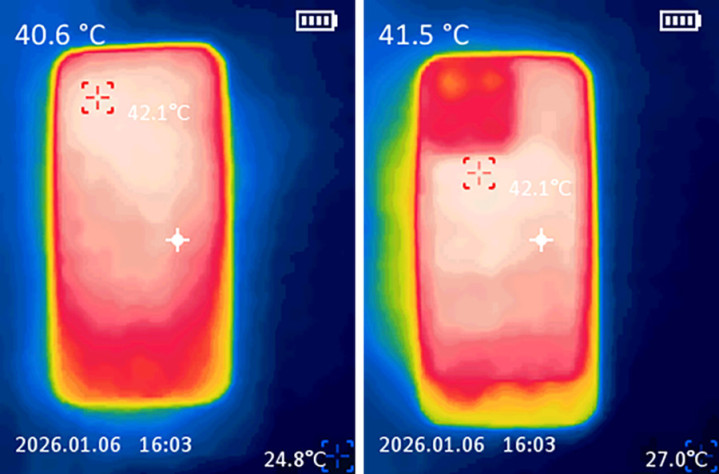 在《原神》最高画质满帧运行半小时后,我们对机身温度进行实测,正面最高温度仅40.6℃,背面最高温度41.5℃,机身仅温热,完全不影响握持手感,确保了性能的持续稳定释放。