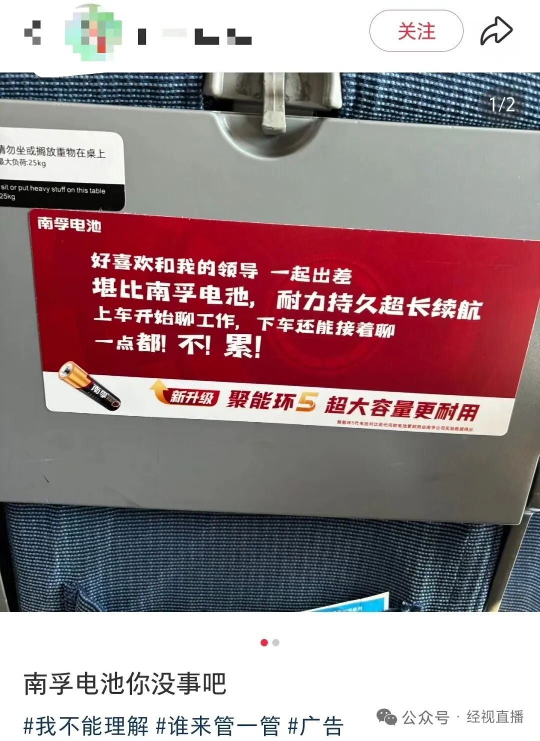 近日,一则出现在高铁座椅背后小桌板上的南孚电池广告语引发关注,内容为:“好喜欢和我的领导一起出差重庆股票配资,堪比南孚电池,耐力持久超长续航,上车开始聊工作,下车还能接着聊,一点都!不!累!”